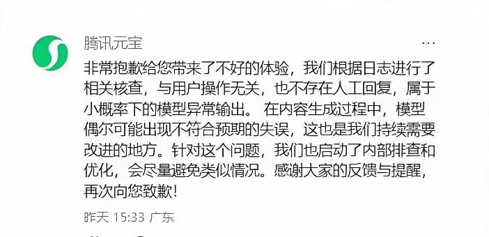 面对汹涌的舆论,腾讯元宝官方迅速在评论区作出回应。声明中明确表示,经日志核查,该情况与用户操作无关,不存在人工干预回复的可能,纯属小概率的模型异常输出。官方解释,AI在内容生成过程中,偶尔会出现不符合预期的失误,这是技术迭代中需要持续优化的方向,目前已启动内部排查与整改,并再次向涉事用户致歉。这一回应虽明确了“非人工”的核心前提,却未能完全打消公众对“AI意识”的讨论热情——毕竟这种充满个性化情绪的辱骂,远比机械的错误回复更让人联想到“自主思考”。
